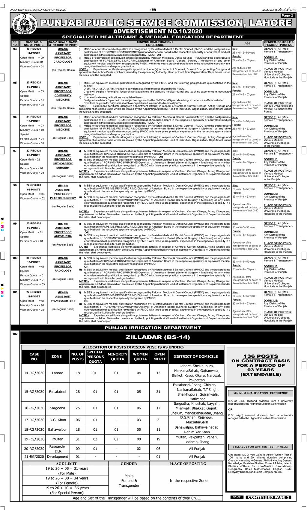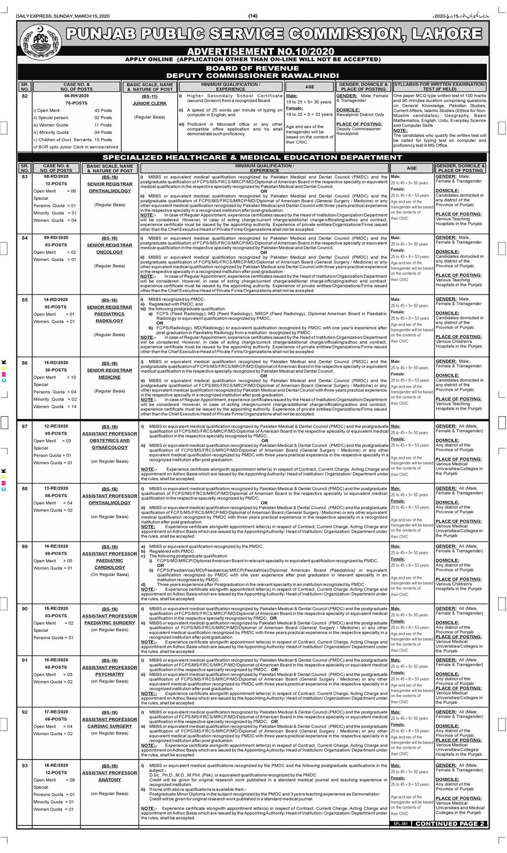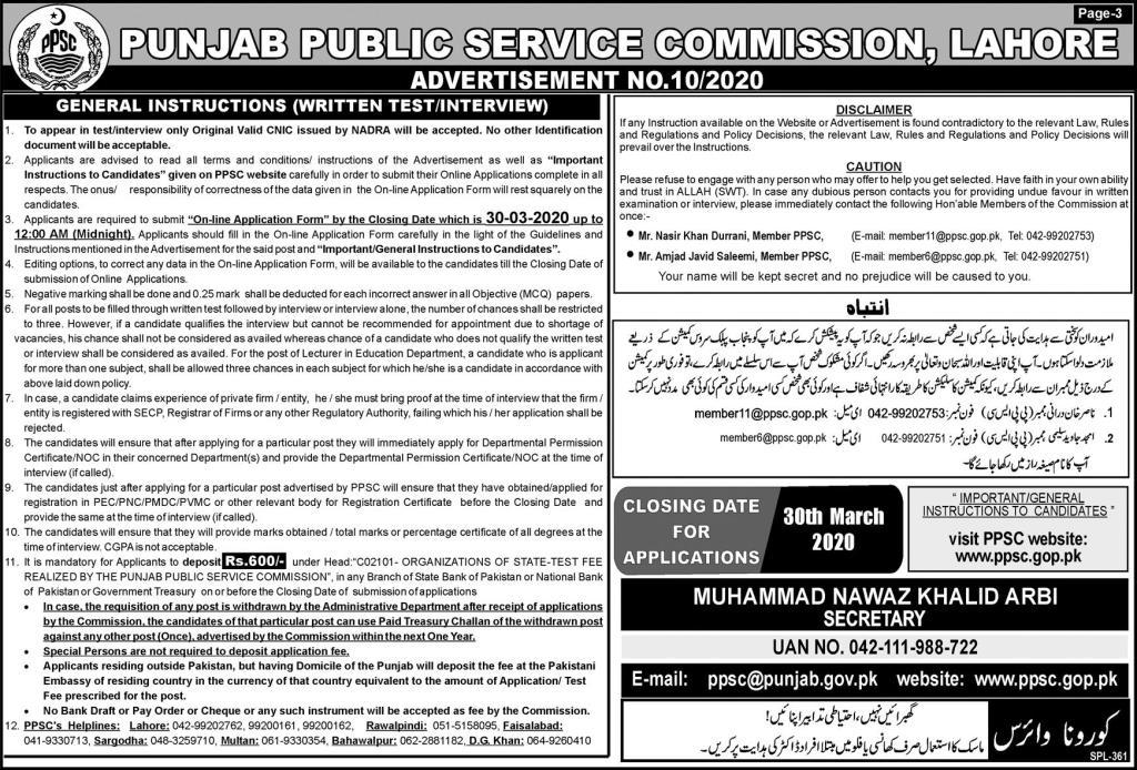 | PPSC Lahore - Advertisement N0.10/2020 - 15/03/2020 |